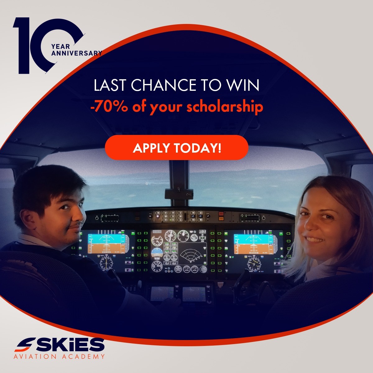 This year Skies Aviation Academy marks 10 years of operation and we are beyond proud of all of our graduate students who fulfilled their dream of becoming a pilot. For this reason, we are giving away one more scholarship of 70% which will be awarded to one of our future students who set his/her heart on becoming a professional pilot with our All-Inclusive EASA ATPL Integrated Course. In order to participate you have to: